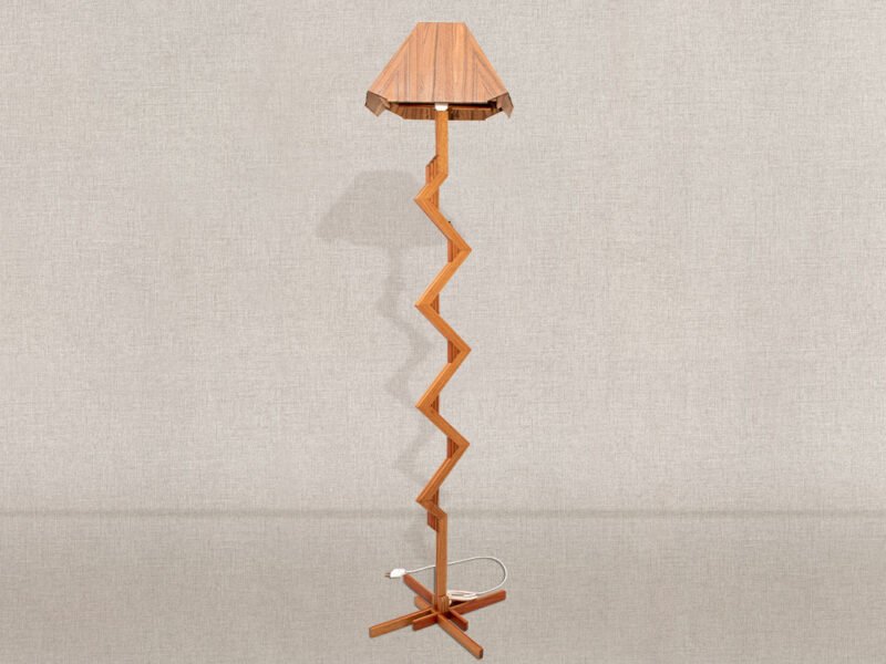 Abajur de madeira nobre, marchetado, com fiação externa, com cúpula de madeira e lâmpada de led.